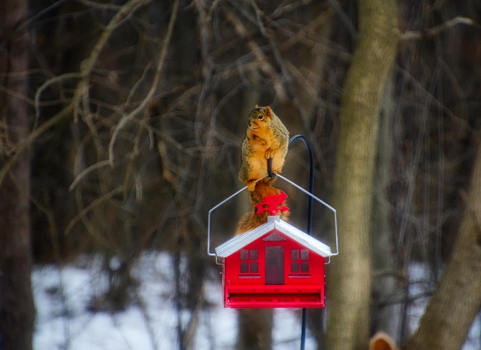 The bird feeder is very popular with our squirrels.π